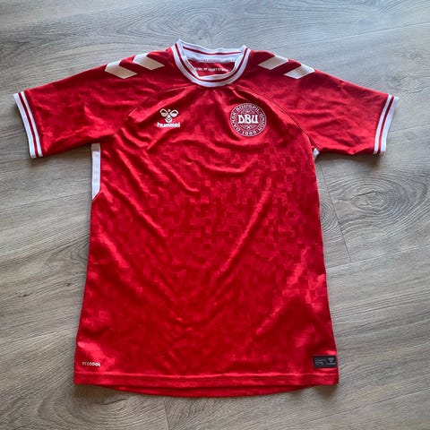 Hummel Danmark fodboldtrøje i størrelse M. Trøjen er rød med hvide detaljer og er designet til mænd. Egnet til fodbold.