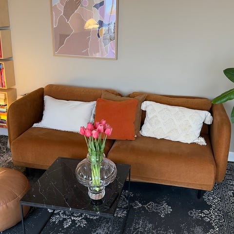 Lækker stol og puf i orange 🍊 fra modellen ellis fra Sofacompany.