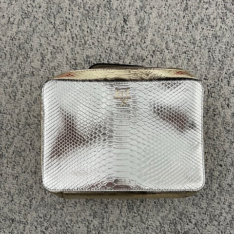 Victoria's Secret taske til kvinde lavet i kunstlæder. Tasken har en sort farve med dekorative nitter og en guldfarvet kæde. Indvendigt er foret med mønstret stof og flere rum til organisering. Tasken har håndtag og en aftagelig og justerbar skulderrem.