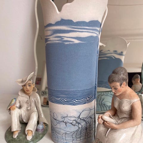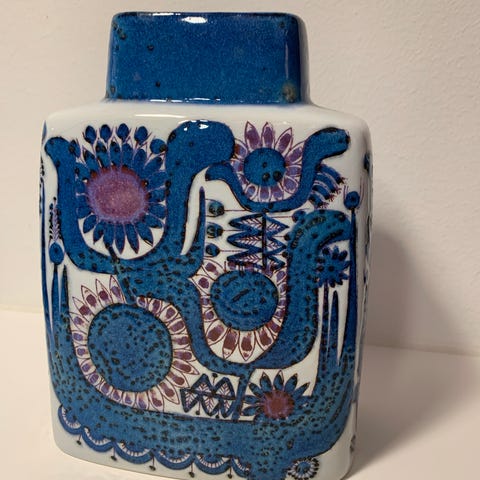Lena Pedersen keramik vase med blå og hvide farver. Der er 3 forskellige mønstre - se fotos. Højde ca 17 cm og diameter 7 cm. Denne vase kan være 2. Sortering