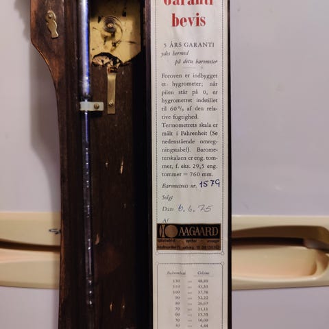 Genia Vejrstation med barometer, hygrometer, termometer og spejl sat i en banjoformet base af træ.