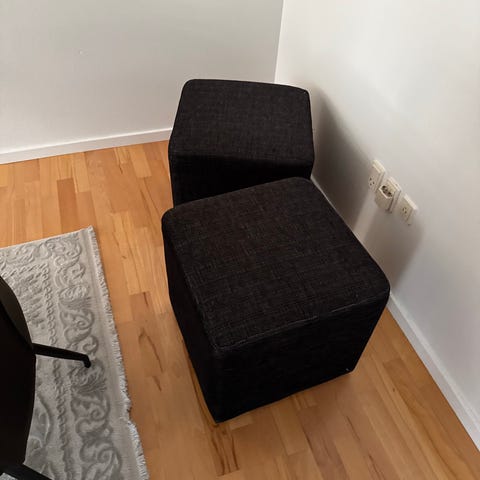 &Tradition sofa puf i sort stof. Designet af Achille Castiglioni. Puf'en har en kubisk form og kan bruges som ekstra siddeplads eller fodskammel.