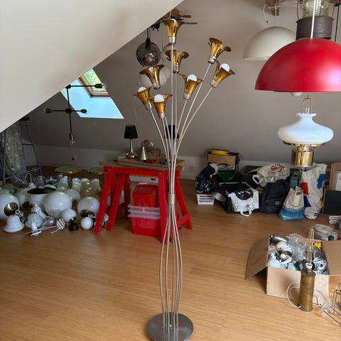 Se sidste foto af hele lampen. Denne smukke lampe er 180cm høj og læsearmen er 50cm. Er lavet af drevet messing og træ. Den fungerer med både ovenlys og læselys - begge med trinløs dæmper. Læsedelen kan drejes og vippes. Der er ingen skader el pletter.
