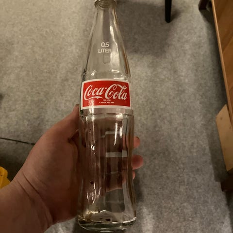 Ikke særligt ofte forekommende dansk Coca Cola flaske, 0,19 liter. 20 cm høj. Hvid tekst påsvejset flasken: Coca-Cola reg. varemærke net. 0,19 L / Coke reg. Varemærke flasken varem. reg. Støbt i flaskens glasmasse: 68 PLM H 14. Flasken ikke rengjort. Sender gerne men ikke via “fiks færdig”. Køber betaler porto.