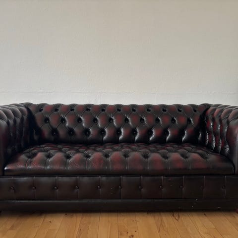 Chesterfield sofagruppe i læder. Brugt ganske lidt. Har stået røgfrit i jagtstue i et par år.