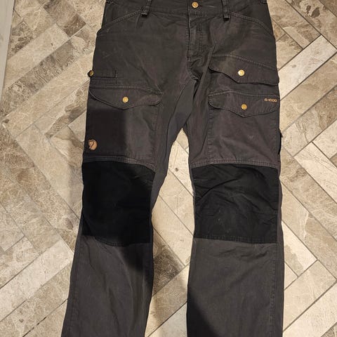 Bukserne er i god stand uden huller eller skader. Det eneste at bemærke er, at Fjällräven-logoet er skrumpet en smule i vask, hvilket er kosmetisk og ikke påvirker funktion eller holdbarhed.