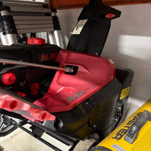 HS 520 sneslynge med rød farve. Maskinen er udstyret med motor og håndtag for betjening. Designet til at rydde sne effektivt.