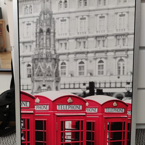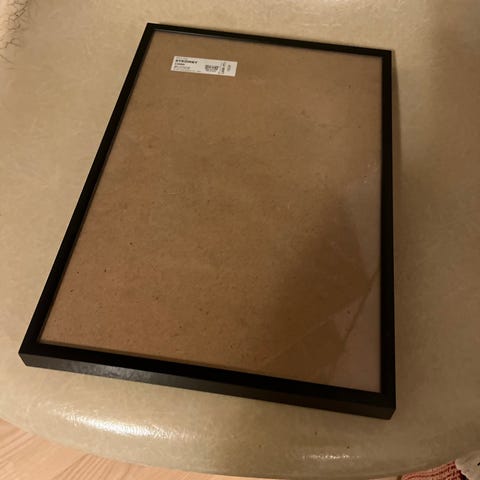 IKEA vægdekoration med motiv af en træbro set fra siden i sort-hvid og beige brune nuancer. Dekorationen har en rektangulær form og er indrammet, velegnet til ophængning på væg. Mål 118x78 cm