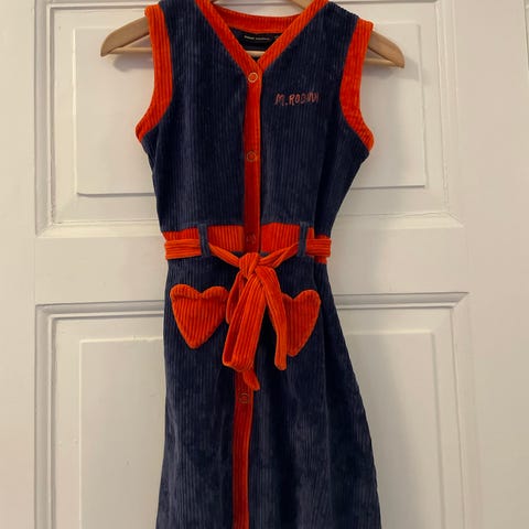 Mini Rodini børnekjole i størrelse 98 til piger. Kjolen er hvid med blå striber og lavet af bomuld.