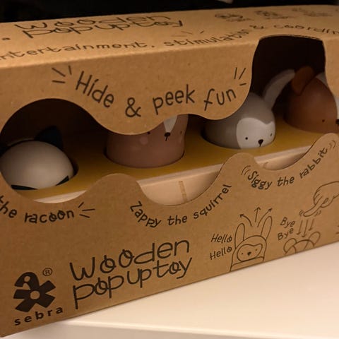 Pop-up med fire dyr. Tryk, vrid og drej for at få kat, hund, kanin og kylling til at kigge op. Der er også billeder af hvad de spiser.