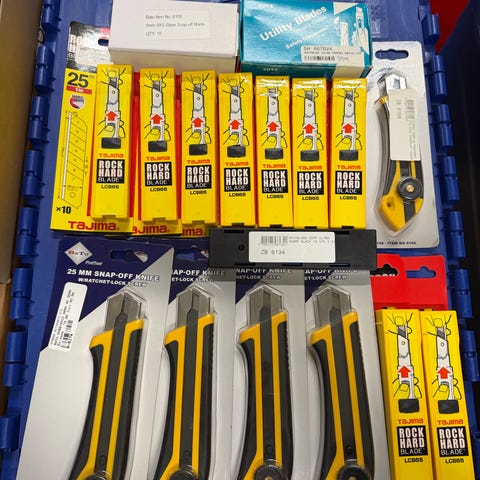 Parkside Utility Knife Set indeholder 33 dele til skæreopgaver i gulvtæpper, pap, karton og papir. Sættet inkluderer en gulvtæppekniv med 10 ekstra blade, en stor kniv med 10 ekstra blade og en lille kniv med 10 ekstra blade. Reservedele er lavet af karbonstål og opbevares i en praktisk overfladningsæske. Produktet bør opbevares utilgængeligt for børn og anvendes med sikkerhedshandsker.