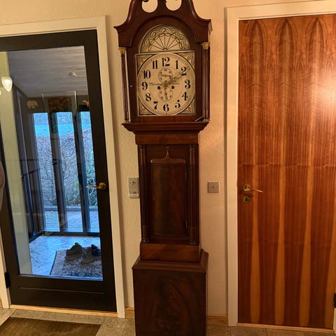 Meget velholdt engelsk standur fra 1800 tallet i mahogni med månefaser ca 2,3 meter høj