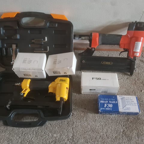 Overfræser fra Biltema meget lidt brugt 200kr• Falke sømpistol 150kr• Fugepistol til trykluft 150kr• Gammel fashøvl 50kr•