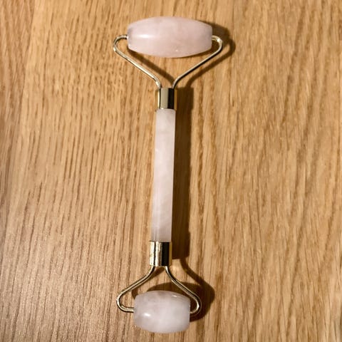 Ansigtsroller lavet af rosa kvarts sten med metalramme i guldfarve. Brugt meget få gange, så gives væk fordi den ikke bliver brugt. Den ene del kan tages af og har været sådan fra start, men har ikke betydning for brugen og kan limes hvis man ønsker.