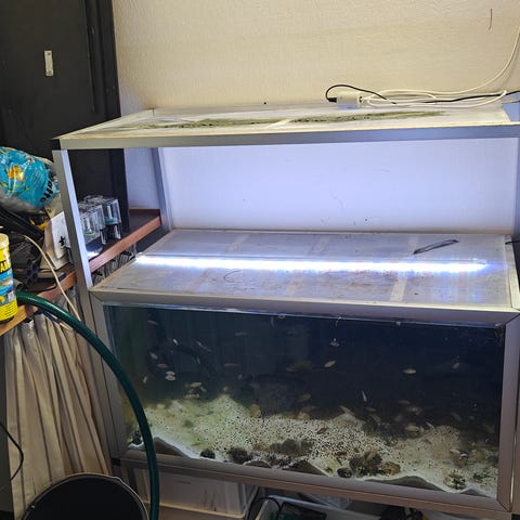 Det er godt brugt og anvendt til opdræt -yngel/reje akvarier, og har selvfølgelig brugstegn, det øverste akvarie skal omfuges, kører dog stadig, da det er øverst der er en utæthed.