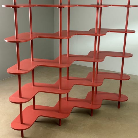 unika Postmoderne snedker reol i rød / rødlige toner nuancer – Ettore Sottsass inspireret design fra 1980/1990’erne i wave bølge buet form.
