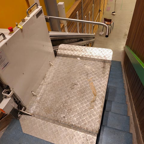 Personlift til vindeltrappe, brugt mellem 15 og 20 gange. Den nuværende trappes totalhøjde er 264 cm, stigning på trin er 19 cm, og grund på trin er 23 cm. Målet fra yderside af trappens ligeløb til yderkant første trin er 44 cm. Prisen var for 2 år siden ca 55.000 kr., men den skal væk nu, så derfor kan den købes nu for kun 9.000, mod at du selv afmonterer den. Der medfølger 2 fjernbetjeninger. Den befinder sig i Struer.
