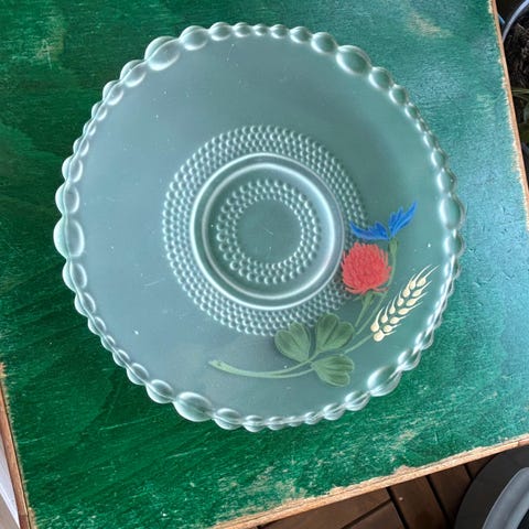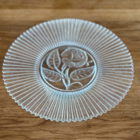 Lille fin pyntetallerken i krystalglas fx til opbevaring af smykker eller servering af en lille kage. Jeg har købt den i en genbrug i Australien, så kender ikke mærket.