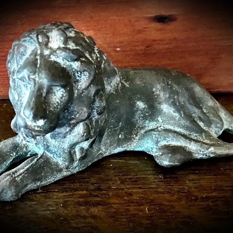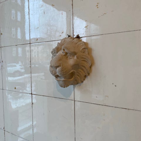 Vægdekoration med løveansigt og integreret planteholder i antik stil. Fremstillet i materiale med patineret overflade, der giver et rustikt udseende. Egnet til ophængning på væg og til brug som dekorativ planteholder.