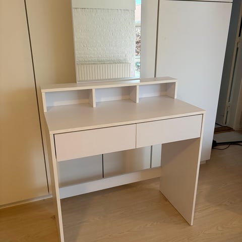 Flot hvidt sminkebord med skuffer, spejl og skammel - fra Jysk - a la model på foto, dog med flere skuffer.