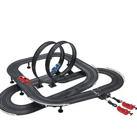 Super fed bane med ekstra skinner og 1 ekstra bil (3 i alt). Den er ikke brugt meget og derfor næsten som ny, og i original emballage (undtagen ekstra skinner).