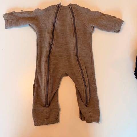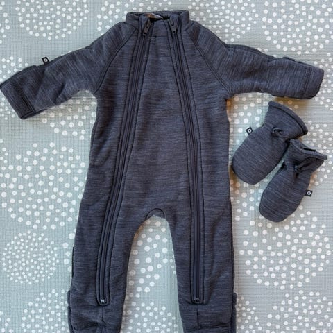 Uldsæt bestående af dragt, sweater og hue i sort uld fra Smallstuff. 100% marinould. Str 56/62.