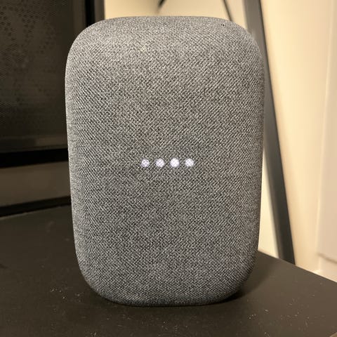 Sælger disse to Google Nest Audio trådløse højttalere, med indbygget Google Assistent (snart Gemini). Højtalerne kan fungere enkeltvis eller som stereopar, og forbindes som udgangspunkt til WiFi via Google Home appen, men kan også forbindes via Bluetooth.