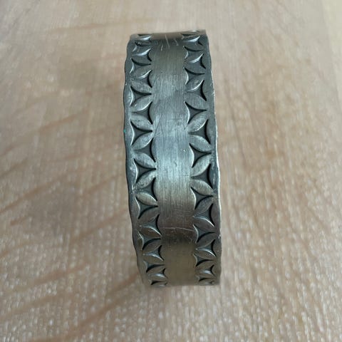 Flot og markant armring udført i tin (pewter) med dekorativt, gentagende mønster. Armbåndet har et råt og moderne udtryk og passer godt til både hverdag og mere kantet stil.