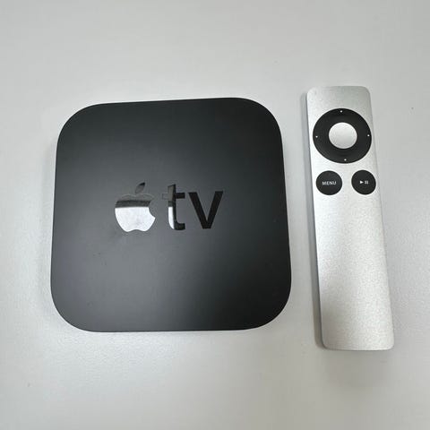 Apple TV med fjernbetjening i sort farve. Apple TV 3. generation. Modelnummer A1427. Understøtter HDMI med opløsning på 720p eller 1080p. Udstyret med 10/100BASE-T Ethernet og Wi-Fi (802.11 b/g/n).