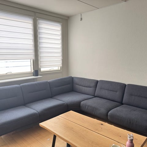 Ilva sofa i blåt stof. God stand, fremstår pæn. Sofaen har en buet form og består af flere dele, som kan skilles ad ved transport/flytning. Den har træben og polstret sæde og ryg. Sofaen er velegnet til opholdsstue eller lignende rum.