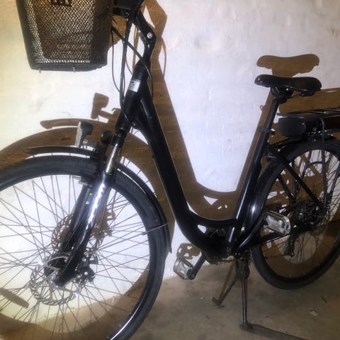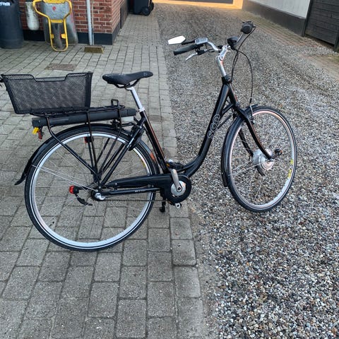 Woom Elektrisk herrecykel med sort stel. Cyklen er udstyret med kurv og bagagebærer med batteri til el-assistance. Designet til mænd og egnet til daglig transport og pendling.