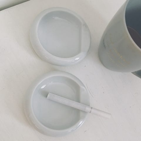 Askebæger i metal med rund form og farvet reliefmotiv, der forestiller bygninger og tårne. Askebægeret har en lågmekanisme og flere riller til cigaretter. Det er velegnet til indendørs brug som askebæger.