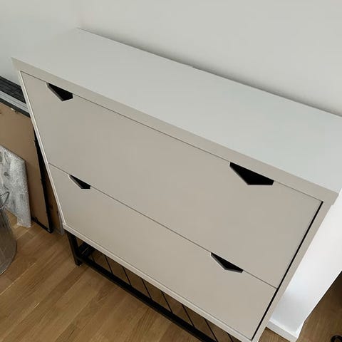 To styk næsten ubrugte skoskabe af fabrikatet vidaXS. Reolen har et gitterdesign på fronten og er lavet af valnøddetræ. Nypris kr. 1.912,-.