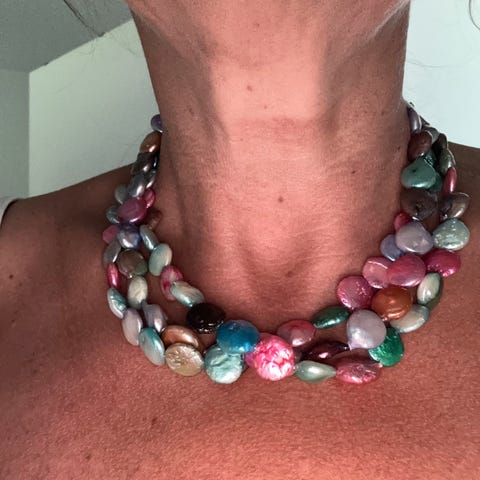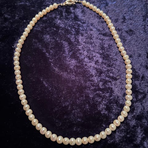 Perlekæde m/sølvblomst og tilhørende ørehænger og ørestik.