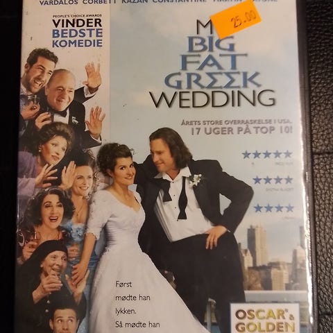 My big fat greek wedding, DVD, komedie, Toula er 30. Og ugift. Hvilket for en sød græsk pige vil sige, at hun er en fiasko. Alle hendes kusiner er blevet gift med græske mænd og fået søde græske babier, så hele Toula's familie er bekymret. Hvilken fremtid går hun mon i møde? Da hun forelsker sig i den mørke, flotte Ian, der dog absolut IKKE er græsk, er hun for alvor på vej ud i problemer. Hvordan vil Ian tackle mødet med Toula's store, fede græske familie? Denne charmerende lille film blev en gigantisk biografsucces og indspillede alene i USA næsten $250 millioner!