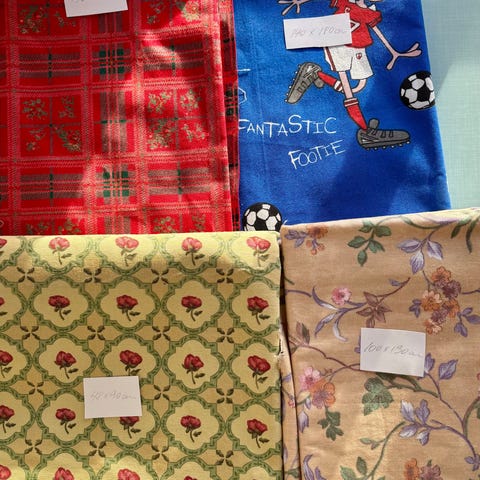 Sæt bestående af flere stykker stof med forskellige stjernemønstre i farver som grå, turkis, rosa, blå og hvid. Stoffet kan anvendes til syprojekter, dekoration eller andre kreative formål.