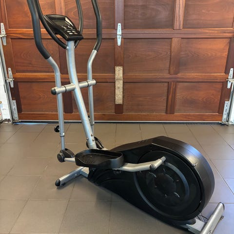 Reebok I-Trainer crosstrainer i farverne hvid og rød. Træningsudstyr med pedaler og håndtag, der kan bruges til konditionstræning. Udstyret med digitalt display til visning af træningsdata.