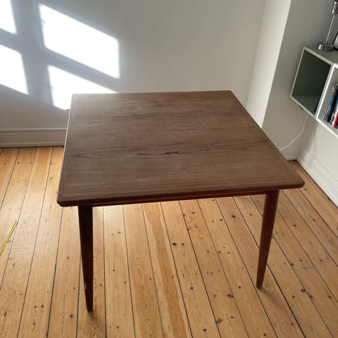 Dejligt teak spisebord i flot stand, et enkelt hak i pladen og tyndslidt laminat (billeder tilføjet)