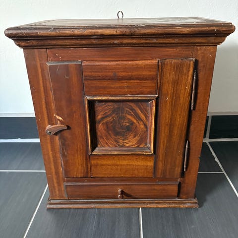.Vintage trævægskab med malede dekorative detaljer på fronten. Skabet har en enkelt dør med hængsler og en dekorativ skuffe nederst. Farven er dyb rød med sort og farverige malede motiver. Velegnet til opbevaring og som dekorativt element i hjemmet.