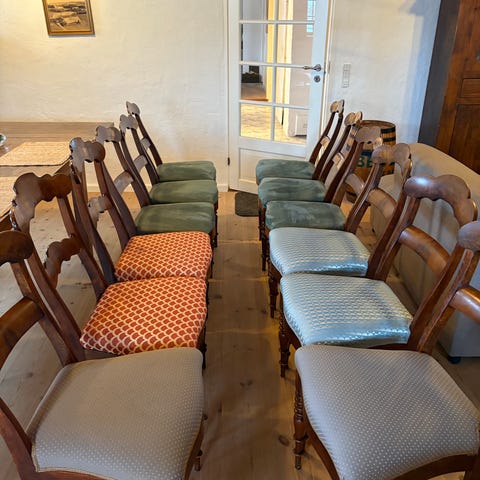 Sæt på seks spisestuestole med grøn møbelstof og træramme. Stolene har et mønstret stofbetræk og udformning med ryglæn og sædepolstring. Trærammen er udført i en mørk træsort med drejede ben og tværstivere. Stolene kan anvendes som spisebordsstole i hjemmet eller lignende miljøer.