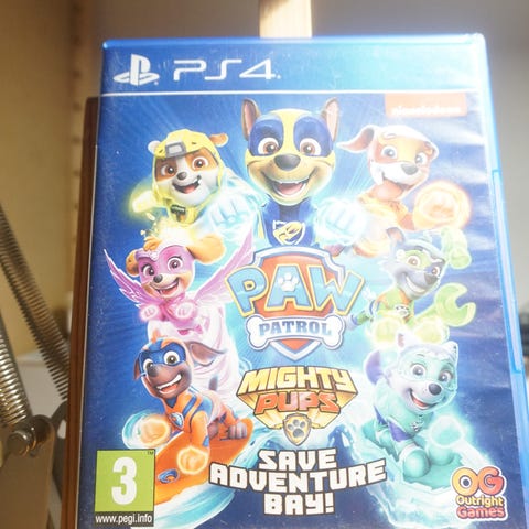 Playstation 4 Paw Patrol Mighty Pups Super Paws spil. Spillet er baseret på Paw Patrol-serien og inkluderer eventyr og missioner med Mighty Pups-karaktererne. Passer til børn og fans af serien.