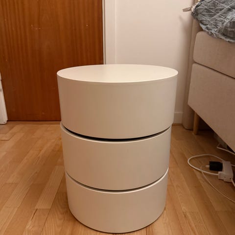 Flotte sengeborde med opbevaring fra Ilva. Hvide med sorte håndtag. Det ene med tre skuffer, det andet led skab og en skuffe.
