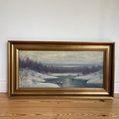Maleri af bylandskab med motiv af bygninger langs en kanal, bro og træer i vinterlandskab. Maleriet er indrammet i en guldramme.