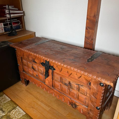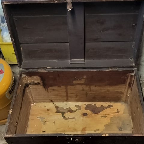 Den smukkeste kiste dekoreret med plader af metal til tundåser. Den er fra Senegal. Jeg ❤️ den. Pga plads må den finde nye eventyr.