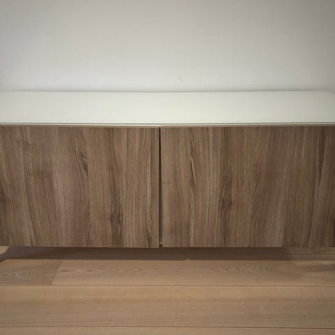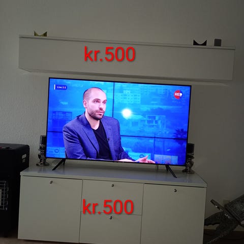 En TV-bord, som bliver brugt som reol. Den er i perfekt tilstand og fejler intet