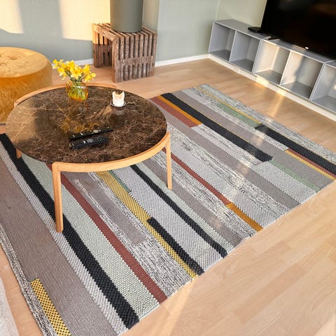 Tæppe med geometrisk mønster i farverne grå og creme. Måler 160x230 cm. Materiale og mærke er ikke angivet.