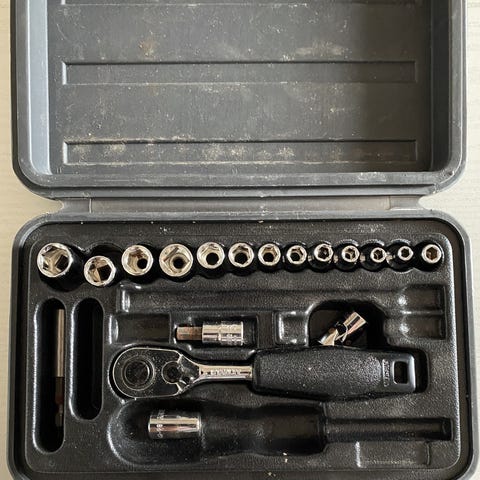 Stanley topnøglesæt med 22 dele, inklusive toppe, skraldenøgle og forlængere. Sættet er designet til forskellige typer skruer og bolte, og opbevares i en sort plastkasse.