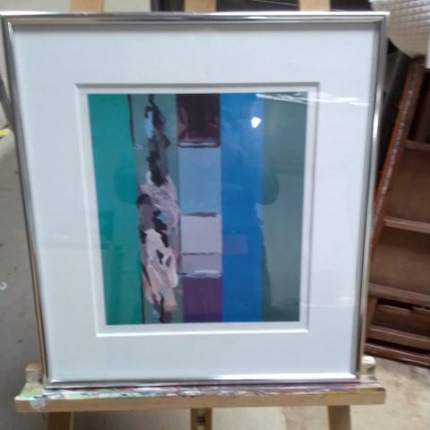 Emil Gregersen litografi med dimensionerne 68x57 cm. Litografiet er nummereret 176/200 og viser et abstrakt motiv i dæmpede farver. Værket er indrammet.