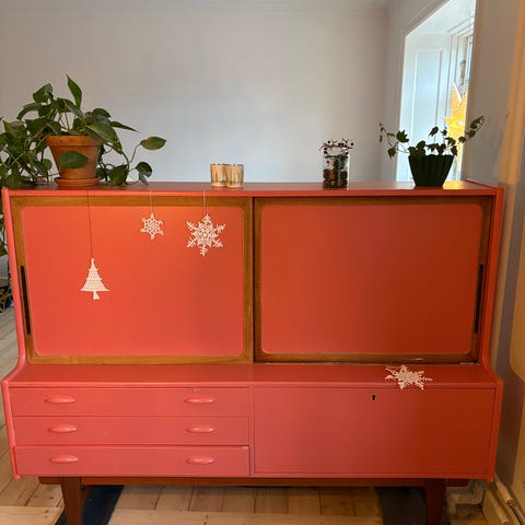 Sælger denne upcyclede, rummelige og farverige skænk med det fineste harlekin-spejl.