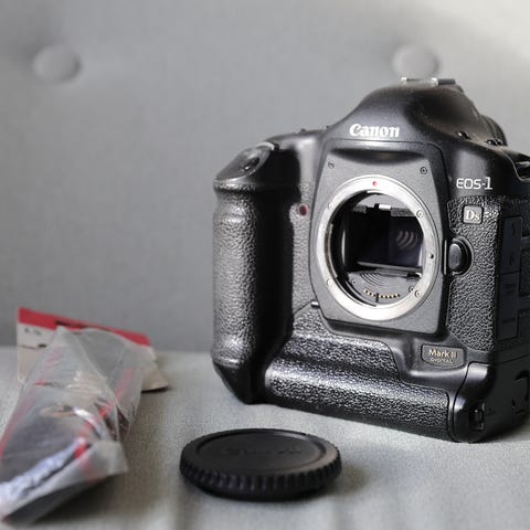 Gammel kriger! Ukendt shuttercount, men alt virker – testet med medfølgende strømforsyning. Måske kan der komme liv i ét eller to af de mange medfølgende batterier. 16 MP, fullframe til EF-objektiver.